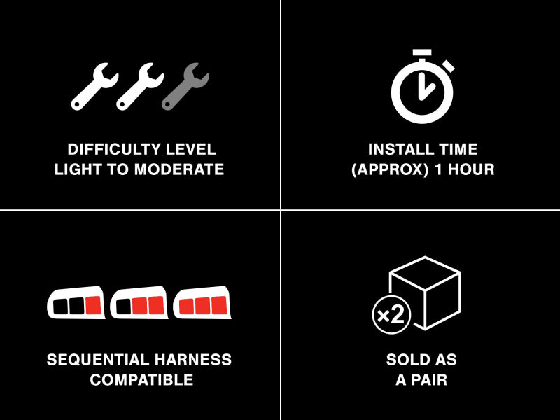 Add the bold iconic styling of the late model Mustang to your New Edge Pony with a set of Raxiom Icon Tail Lights. These tail lights feature built-in modern LED technology that is used for both the reverse lights and running light rings to dramatically transform the appearance of your 1999-2004 Mustang. Raxiom Icon LED Tail Lights are manufactured using state of the art LED electronic components with a simple plug-in connector that easily inserts into the stock wiring (or Raxiom sequential) tail light harness for a simple straight forward installation. The high intensity LED running light rings of these Raxion Icon Tail Lights not only look great, but they also improve your driving safety as they are much brighter than the standard factory incandescent bulbs making sure you are clearly seen at night. These Raxiom Icon LED Tail Lights are designed to work with your existing Raxiom Sequential Tail Light Harness to give your New Edge Pony the high tech styling of the late model Mustangs. If you would like a slower speed for the sequence of your tail lights after you install the optional Sequential Tail Light Harness, to get that modern muscle car styling, combine the Harness...